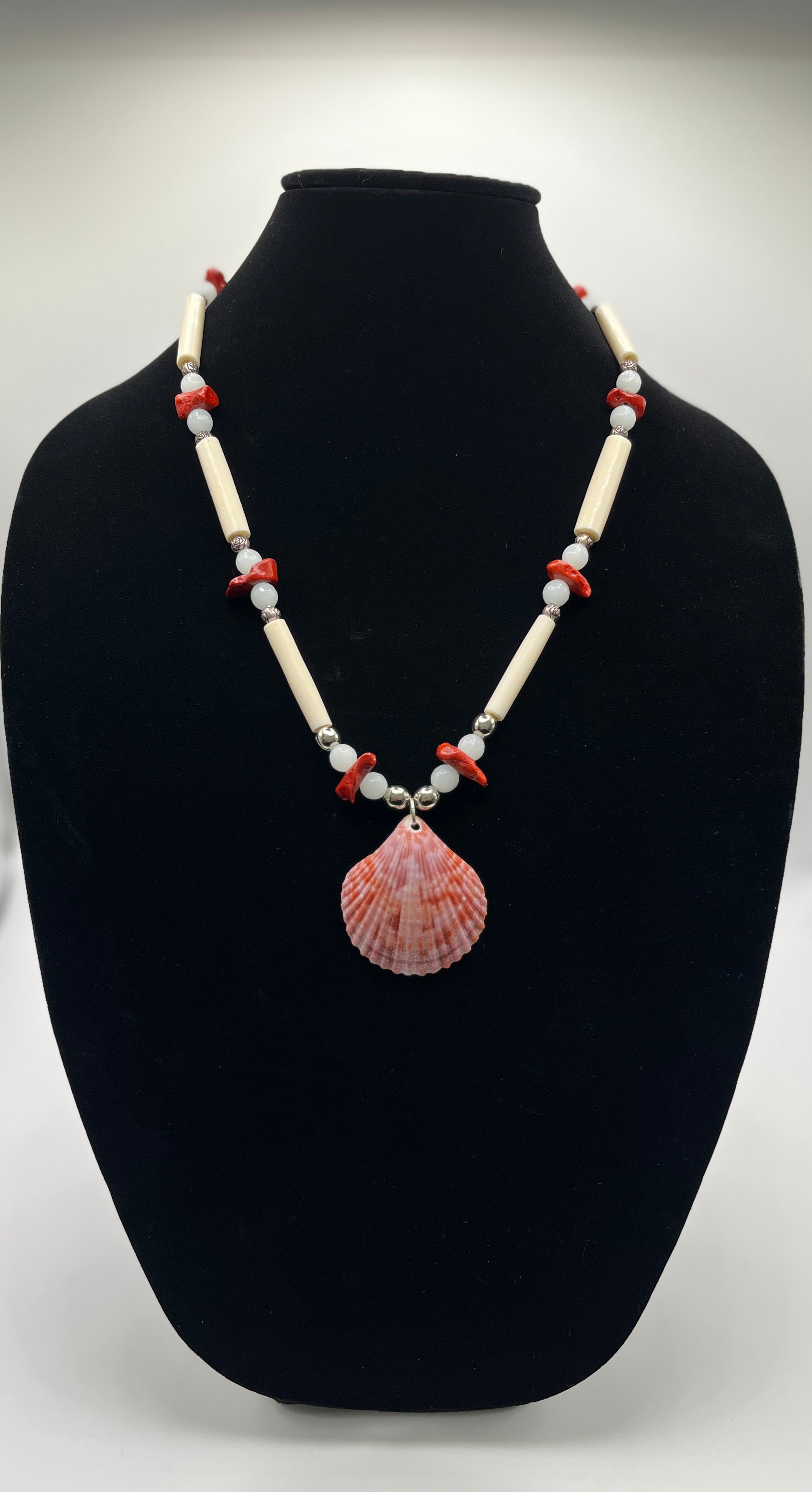 Bead and Bone Necklace with Shell; Red