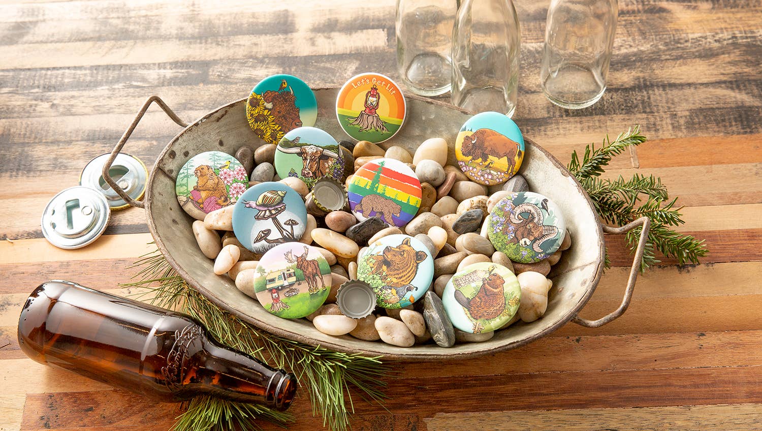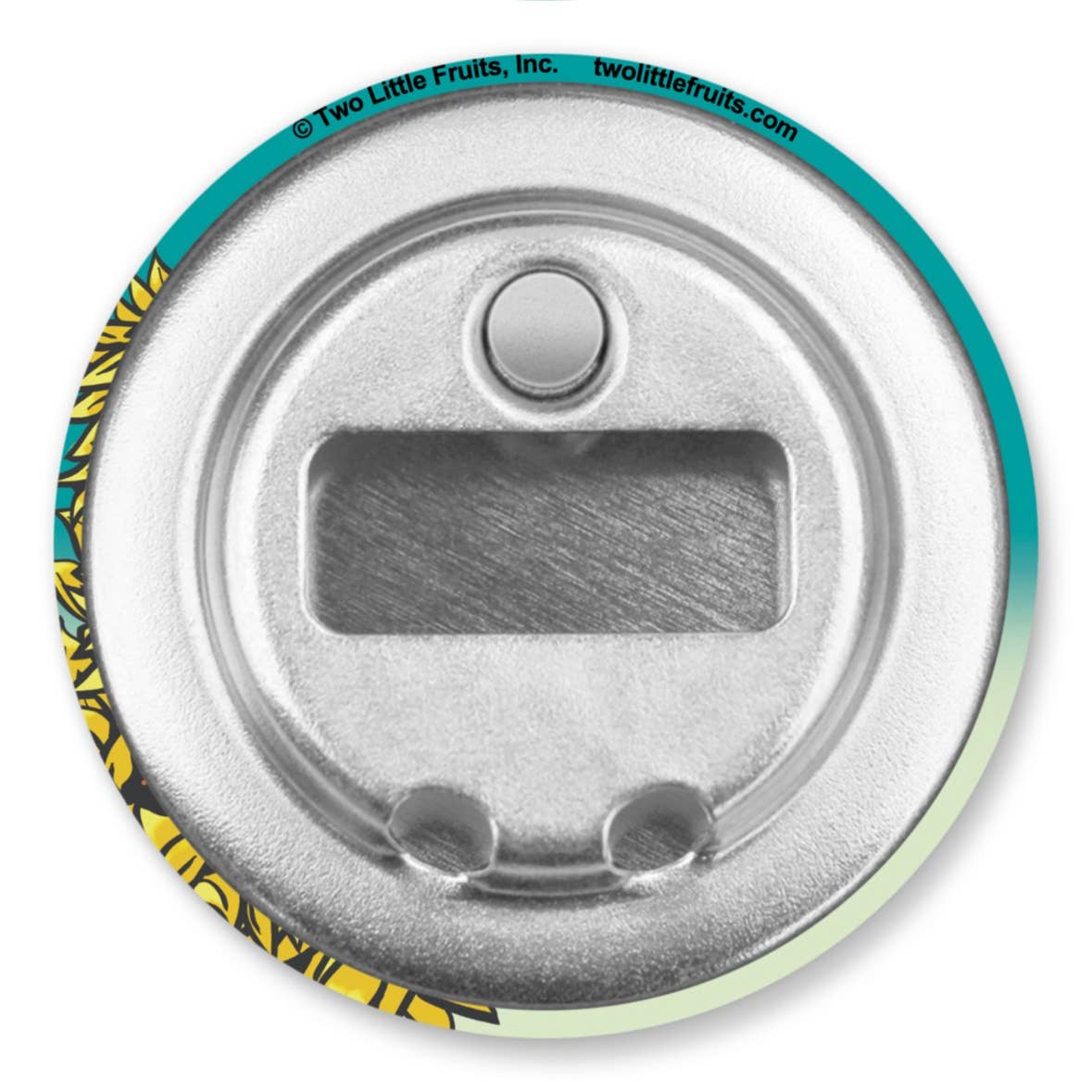 Sunflower and Bison Magnetic Matte Bottle Opener - Our Round Button Magnetic Bottle Opener has a soft-touch matte finish. A built-in neodymium Cap Catcher magnet attracts loose bottle caps and helps you keep this bottle opener handy with plenty of power to stick to your fridge. The durable, all-metal back will open bottles all night. These 2.25" round bottle openers fit in your pocket while keeping a slim profile and fit perfectly in your hand. They are weather-resistant, scuff-resistant, with no glare.