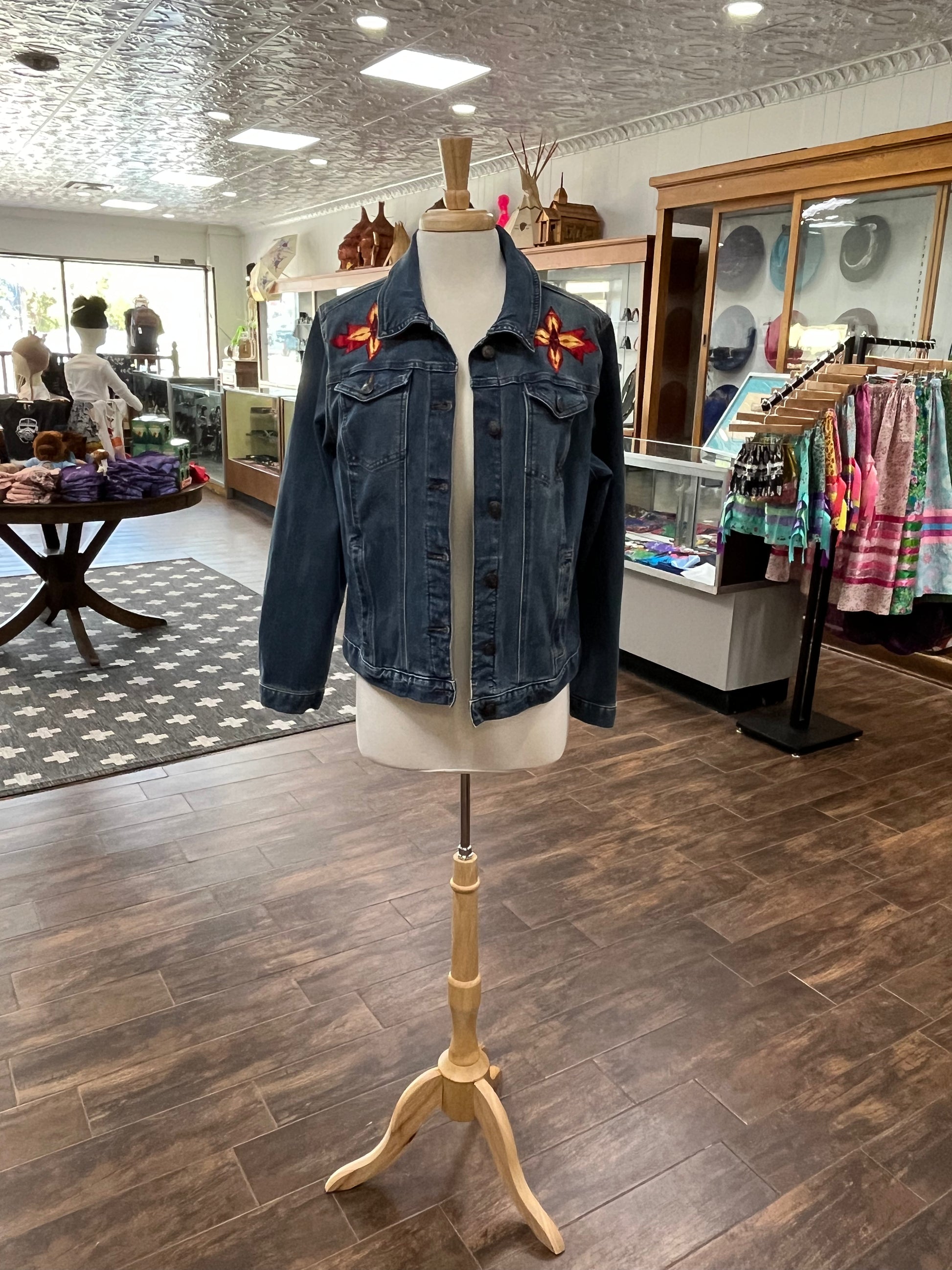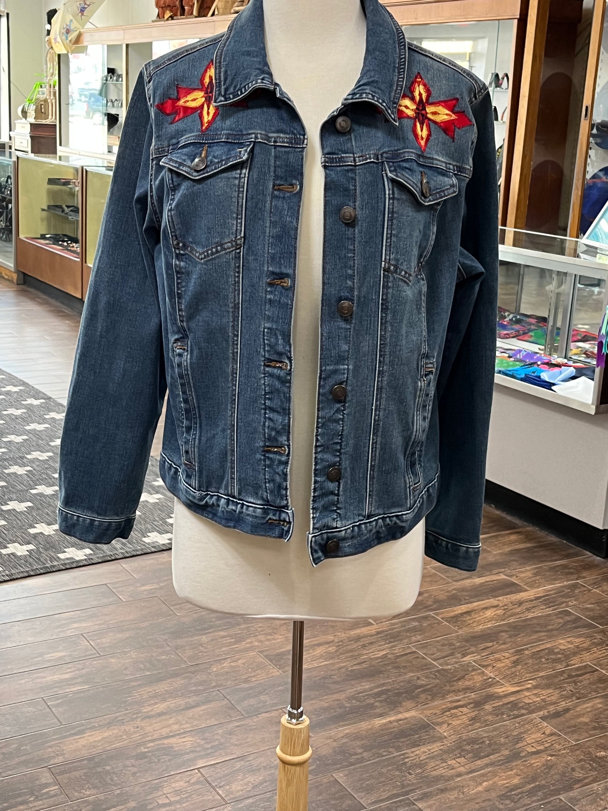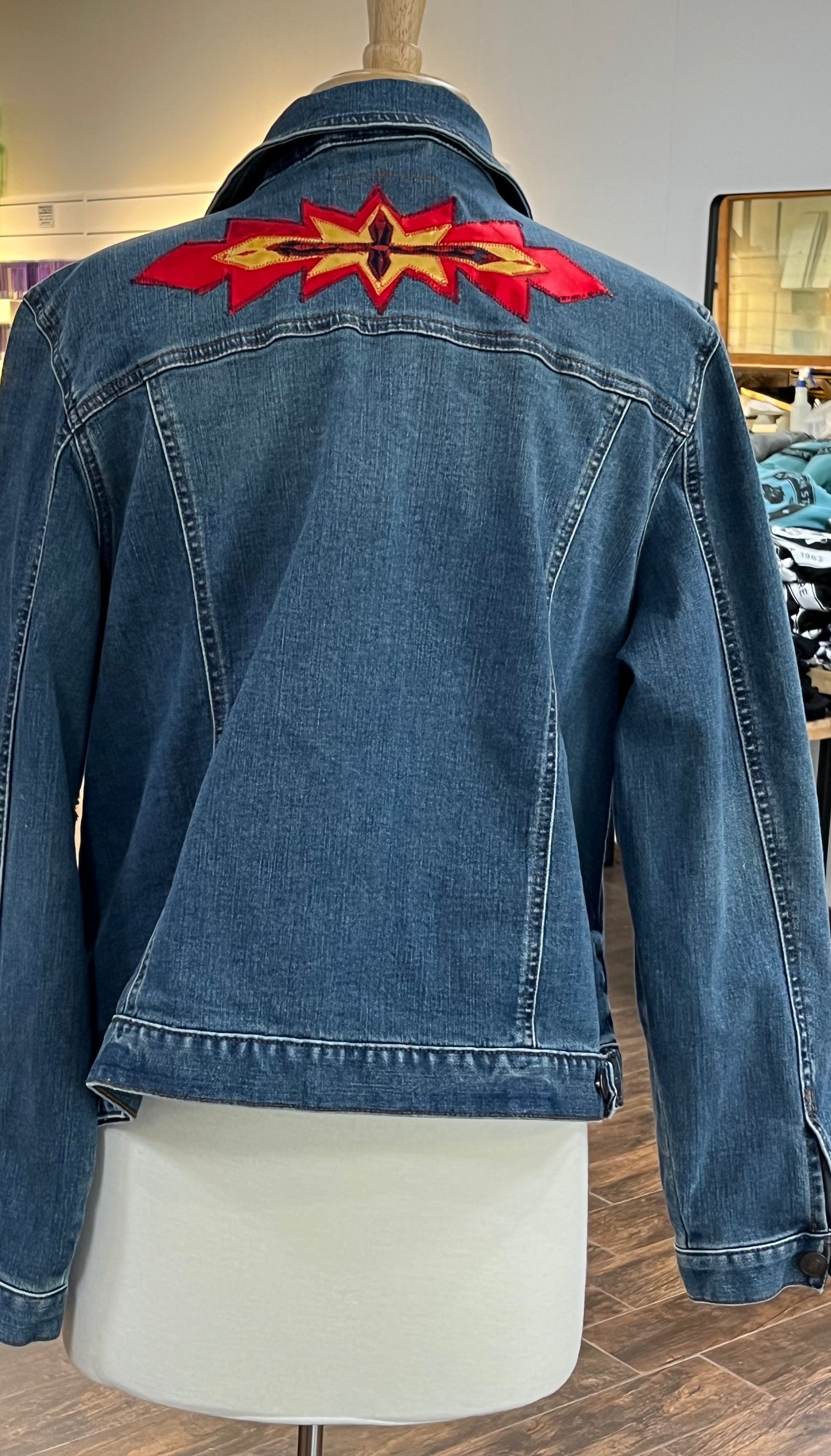 Women’s Denim Jacket with Ribbon Work; Red and Gold